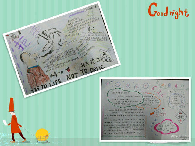 按照活动要求,各辅导员积极安排我院学生关于禁毒的第二课堂活动。为保证活动效果,各种活动辅导员班主任都是亲自部署,亲自参加。15级各专业班级开展了禁毒主题班会,会中再次强调了毒品的危害,倡导大家“珍爱生命,拒绝毒品”。并通过知识问答等多种形式,将班会开的丰富多彩。会后,安排同学们写出心得体会。13、14级各专业班级开展了禁毒手抄报比赛,同学们视毒品为恶魔,将毒品的危害用绘画的形式展现出来,给同学们再次敲响了警钟。
