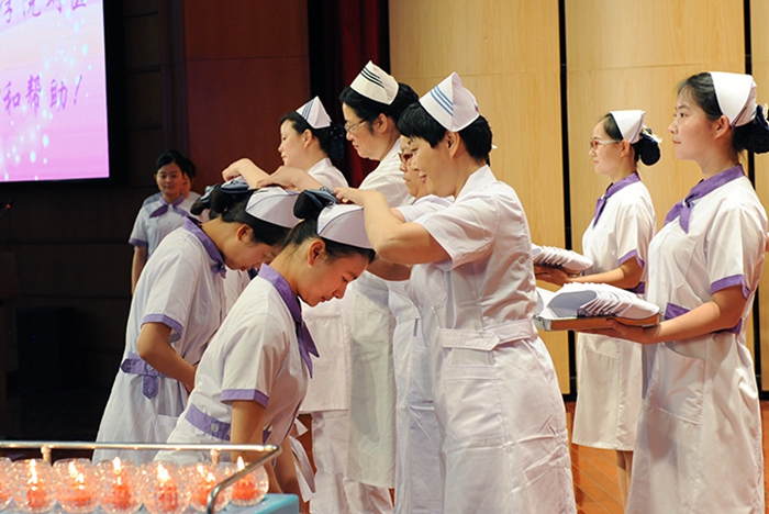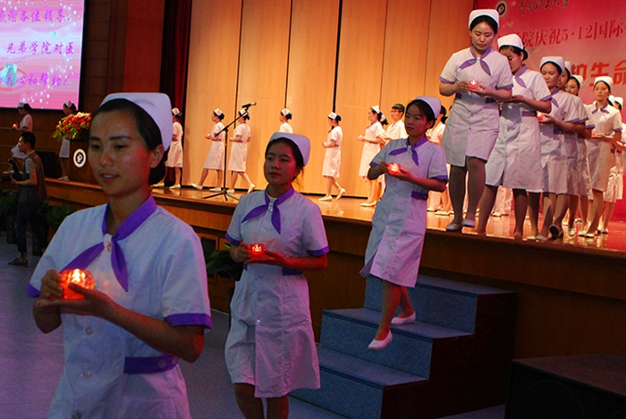 庆祝活动在国歌声中开幕。首先进行的是“授帽传光”仪式,市人民医院护理部主任曹君玲、我校第一附属医院护理部主任牛冬花、第二附属医院护理部主任王淑花、医学院护理专业首席指导教师高晓梅为医学院2012级护理专业本科学生“授帽传光”,50多名学生带上洁白的护士帽,接过照亮生命的烛光,在老师的带领下全体护理专业学生举起右手,庄严宣誓。即将进入临床实习的2012级护理专业学生王佳乐代表12级学生汇报了三年来的学习成果和做好临床实习的决心和信心。校长邹友峰发表讲话后,医学院护理专业学生进行了护理礼仪展演。