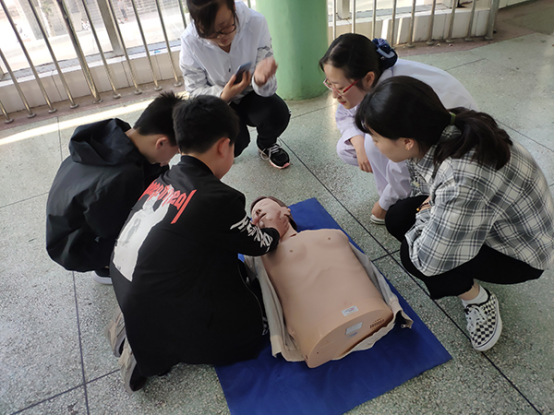 讲座主要为学生们介绍了心脏骤停的常见原因、心肺复苏术的步骤方法与注意事项等理论知识,并指导学生在模型人上进行操作,针对操作中的细节进行指导。学生们对这项能够挽救生命的技术产生了浓厚的兴趣,认真地聆听讲解,并积极进行操作练习。