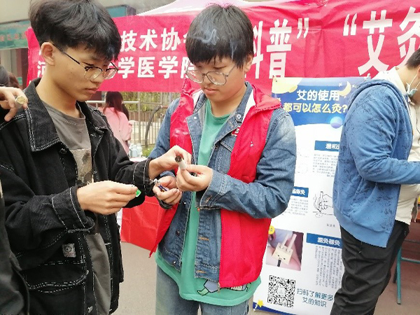 活动从下午三点开始,到六点结束,虽然只有短短的三个小时,但也吸引了大批的同学和教职工的关注。在现场,团队成员向大家宣讲辨识各种艾绒及艾条好坏的知识。