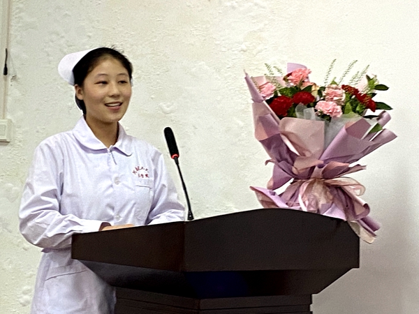 优秀学生代表仝祎冉在大会上发言,她表示:本次比赛的赛程设置及安排面面俱到,门类齐全,不同形式的比赛同时进行,多管齐下,在参与的过程中收获了成长,而赛场上的精彩纷呈与舞台后的刻苦磨练也让他们收获颇丰,最后还对他们的“真命老师”王蕾老师的言传身教表示了感谢教师代表庞攀在发言中则引用习近平总书记的话提出了对学生的殷切希望:敬佑生命、救死扶伤、甘于奉献、大爱无疆!