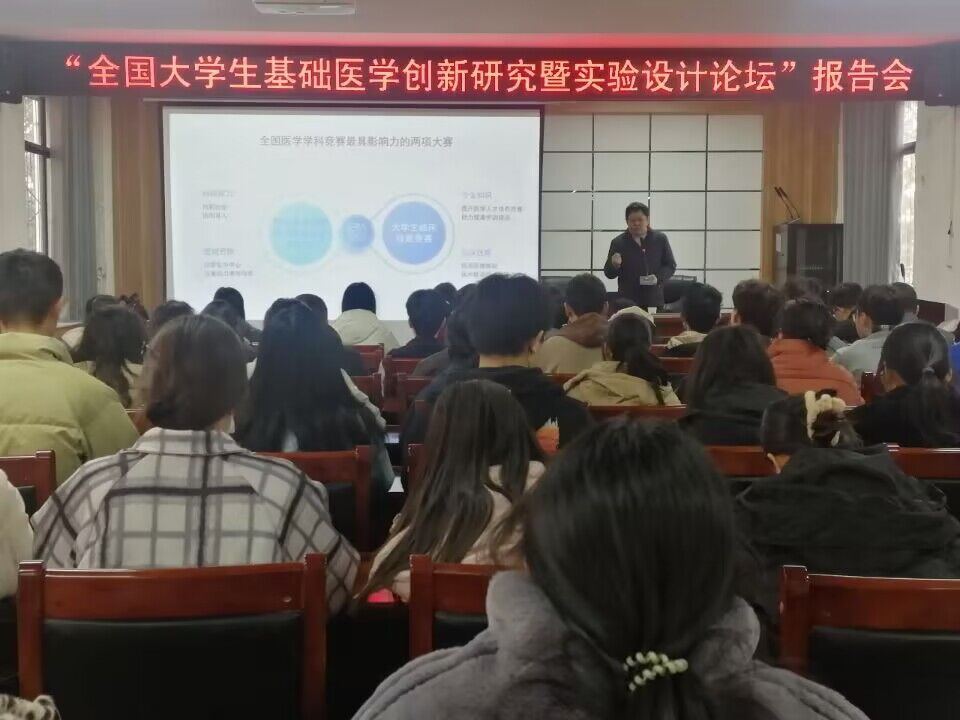 为了更好提升我院学生自主性和原创性的科研思维和实验操作技能,深化“新医科”背景下医学人才培养模式改革,持续推动医学人才培养质量提升,2023年11月28日下午,学院特邀请作为指导老师四次获得金奖、河南大学基础医学院刘中华副教授就备战“全国大学生基础医学创新研究暨实验设计大赛”进行专题辅导。会议由教学副院长陈文波主持,学院师生90余人参加。