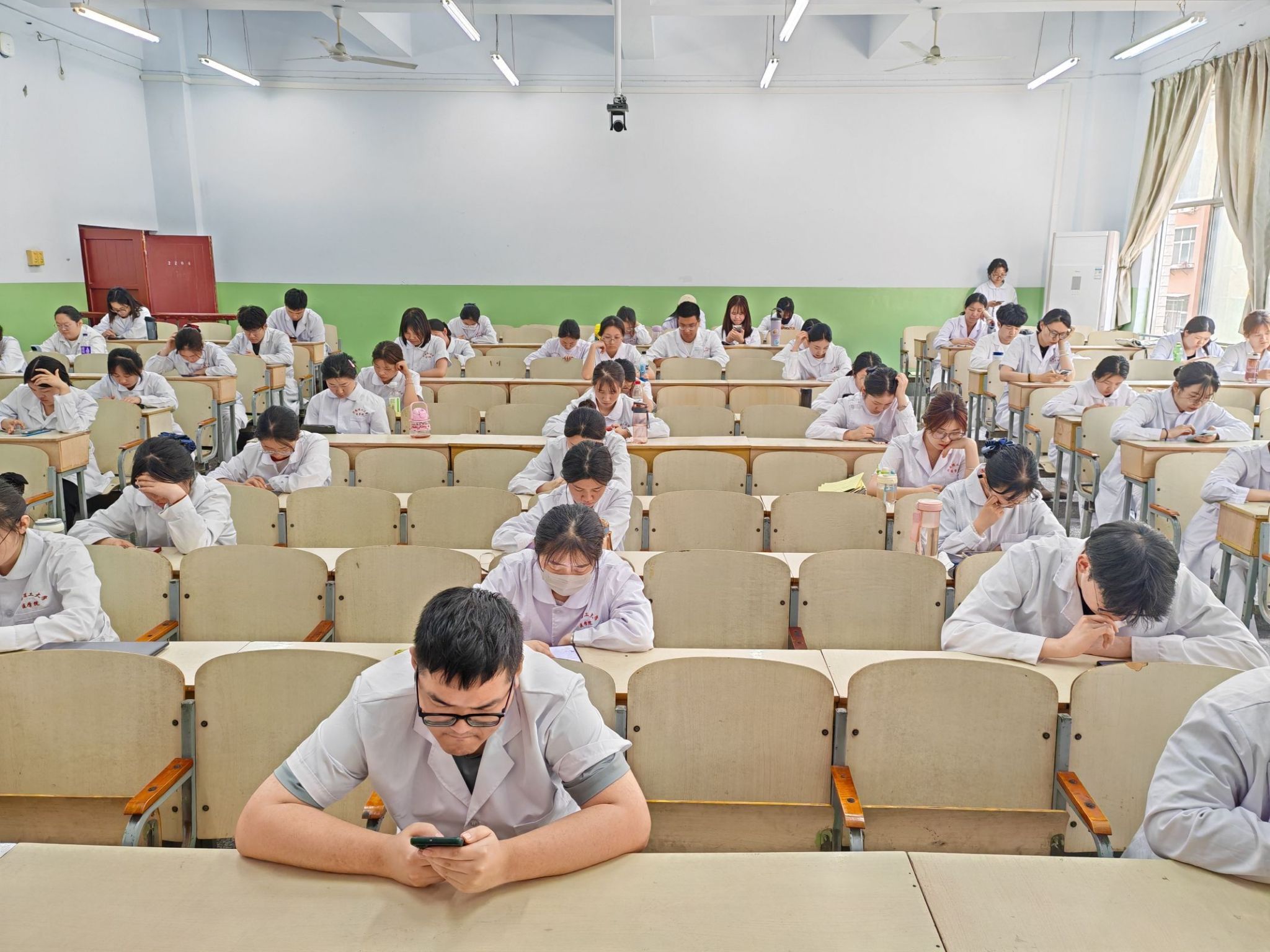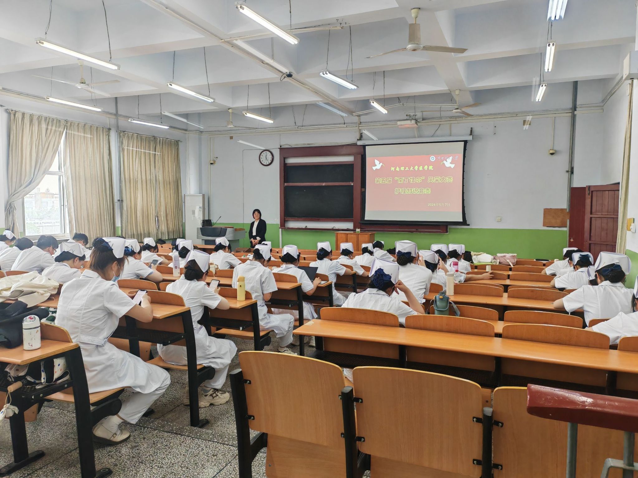 经过多天的报名和筹备,护理知识竞赛于5月7日下午,在北校区第二教学楼举行,共有来自2021级护理学、2023级护理本6个教学班的176名学生参加了竞赛。此次竞赛采取线上和线下相结合的形式,借助“问卷星”平台,制作竞赛试卷,同学们集中在教室,通过扫描二维码进行线上答题。