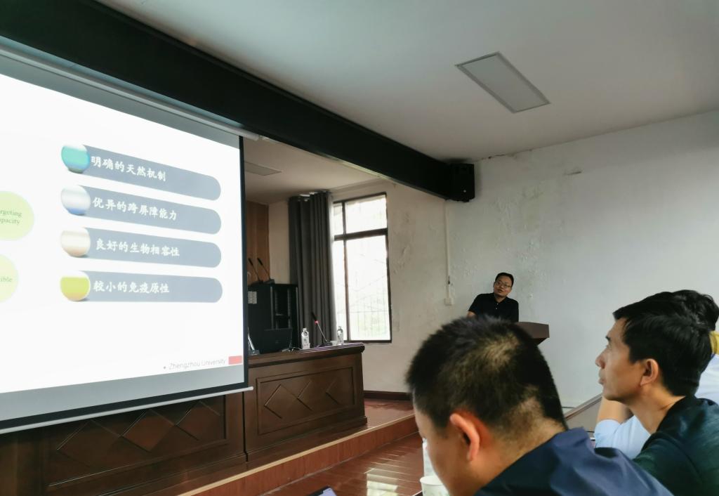 史进进,郑州大学药学院教授,博士生导师,河南省肿瘤重大疾病靶向治疗与诊断重点实验室副主任、药学院药物创新与转化研究所主任、河南省生物工程研究中心副主任。国家优青,河南省杰青获得者,河南省高校创新团队负责人,中原青年拔尖人才,河南省高层次人才,河南省高校科技创新人才,河南省药品监督管理局外聘专家。一直从事药剂学领域研究。主持国家、省部级项目16项。获河南省科学技术进步奖一等奖(排名2)、河南省教育厅科技成果一等奖等。以第一作者或通讯作者在Sci. Adv.、Nature. Commun.、Adv. Mater.等高质量期刊发表SCI论文70余篇,授权国家发明专利10项,合作开发转化1项。任中国颗粒学会青年理事、河南省药学会常务理事、国际权威期刊AJPS(IF:11.2)、NR(11.1)、View(8.9)的青年编委等。 报告会上,史教授从临床肿瘤和脑卒中诊疗实际问题出发,结合自身研究经历,深入浅出地介绍了仿生型药物递送系统的研究背景、研究思路、相应的科研技术及未来发展方向。