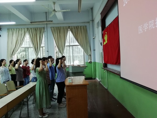 最后,在庄严党旗的见证下,支委会组织委员王安妮带领大家宣读入党誓词,5名同学正式成为预备党员。
