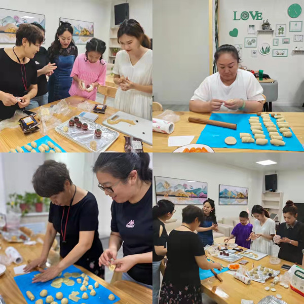 活动现场,教师党员提前将准备好的饼皮原料、各种口味的馅料、手套、模具等材料一一摆放。在学院擅长烘焙老师的指导下,大家认真的按照制作步骤精准操作,有的揉面团、有的称重、有的包馅,待压模成型成品完成的那一刻,大家看到自己第一次亲手制作的月饼,喜不自禁,成就感满满。在阵阵欢笑和真诚的夸赞声中,吸引了更多的老师参与其中。在教师党员的巧手下,一个个生动的造型跃然案上,清雅的荷花、富贵的牡丹、热烈的玫瑰、金灿灿的花生、胖嘟嘟的柿子……其中花生和柿子的月饼造型最受欢迎,不仅因为它们可爱的造型,更因为它美好的寓意“好‘柿’发‘生’”。随着烤箱炙热的烘焙,香甜的味道溢满了桂花环抱古朴的办公楼,更多的老师闻“香”而来,品尝着可口的月饼,体味着这即将到来的传统佳节蕴含的团聚之乐。