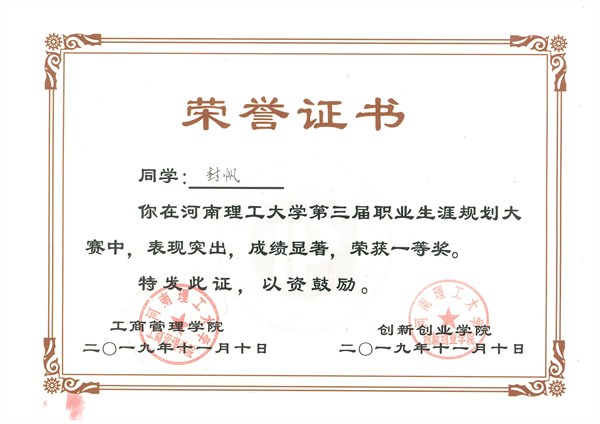 我院封帆同学喜获河南理工大学职业规划大赛一等奖