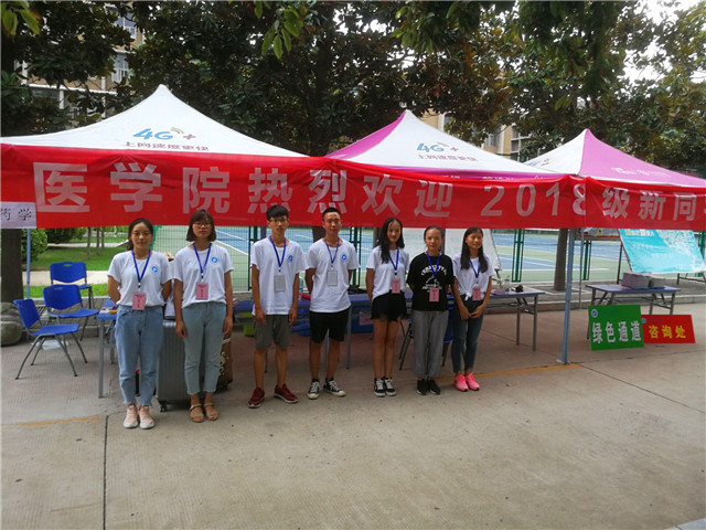 为迎接18届专升本新生,8月31日上午,我院志愿者代表团在医学院楼下开展迎新工作。此次迎新志愿者代表团由我院学生工作办公室李金丽老师、部分16.17级学生组成。